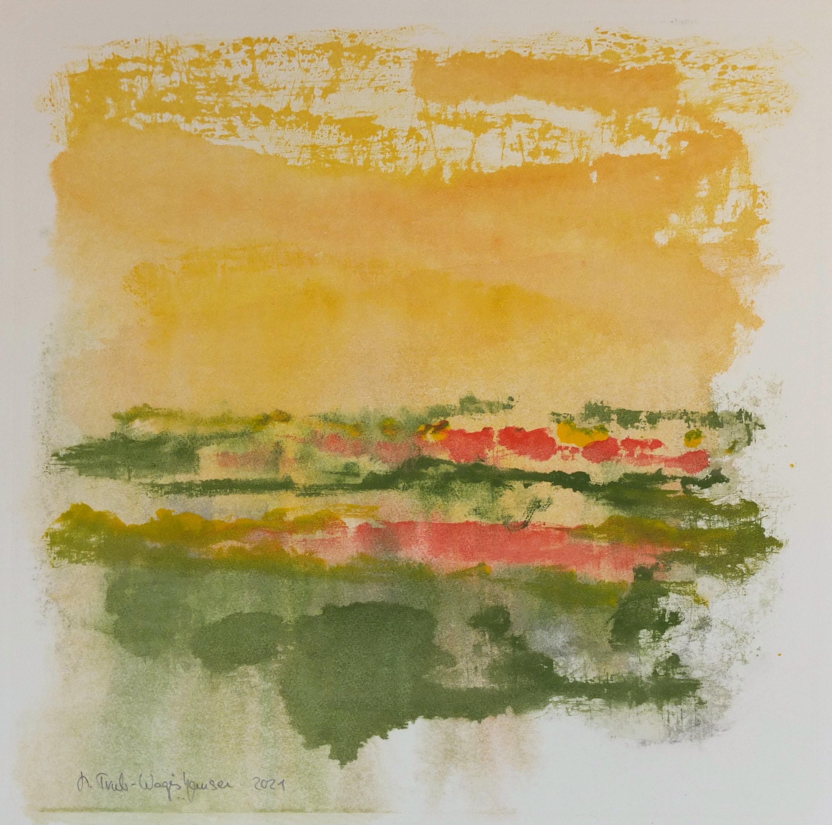 Dieser gelbe Himmel stammt ebenfalls aus der Serie mit 73 Motiven. Die spezielle Technik die von Helga Trub-Wagishauser hier ausgelotet wird, kommt ihrer Suche nach dem Spiel der ungreifbaren Vorstellung mit dem ganz konkret berührbaren Medium farbiger Pasten, in sehr grundsätzlicher Weise entgegen.
