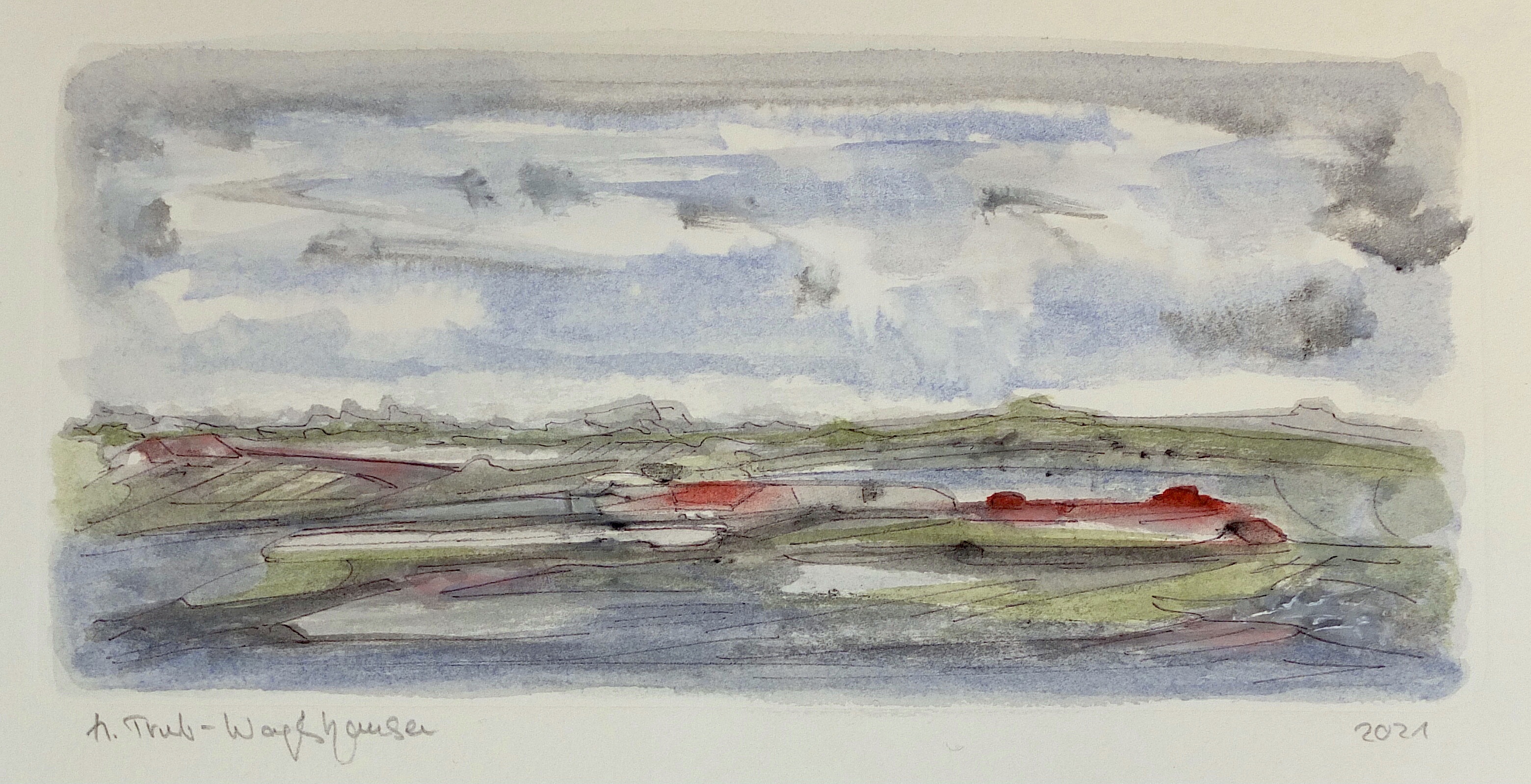 Wie Hasen in ihren Sassen sitzen die Häuser in dieser phantastischen Landschaft. Das Bild stammt aus einer Serie von 24 Motiven, die 2021 wie eine Vorstufe zu „73 Landschaften“ von Helga Trub-Wagishauser geschaffen wurden und gehört darin zu den figürlicher anmutenden. In jenen Werken kommt zu der sehr rudimentären Drucktechnik die in besagter Folgeserie intensiv ausgelotet wird, ein weiterer Eingriff in die hervorgebrachte Landschaft hinzu.